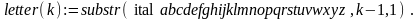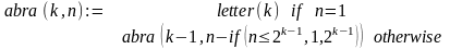 Построим более общую программу-функцию, чем это требуется по условиям задачи. Пусть abra(k,n) n-ая буква в последовательности, полученной на шаге k (k=1..26). Тогда ясно, что abra(k,1) равно k-ой букве латинского алфавита. Этот факт можно взять в качестве базы рекурсии, а функцию для определения этой буквы записать так: