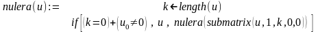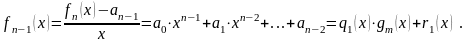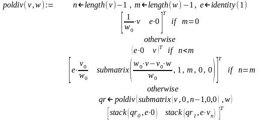 Задача 29. Пусть выполнены соотношения (10)(11), то есть многочлены fn(x) и gm(x) степеней n и m (n,m0) соответственно заданы своими коэффициентами в виде компонентов векторов v и w. Пусть, далее, при m=0, то есть если gm(x) есть константа, gm(x)0. Составить программу-функцию нахождения частного q(x) и остатка r(x) при делении fn(x) на gm(x):