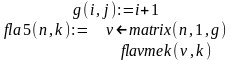 B1. Способ A3 решения задачи 1 при k=2 хоть и несколько громоздкий, но он достаточно просто переносится на общий случай. При этом естественно считать k аргументом функции. Тогда решение задачи дает рекурсивная программа-функция flave(v,k), где v=(1 2 3 ... n)T вектор. Однако проще использовать для этих целей функцию fla4(n,k), формирующую по заданному целому n требуемый вектор v, а затем уже обращающуюся k flave(v,k).