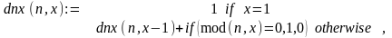 Рекурсивную функцию dnx(n,x), по которой последовательно подвергаются испытанию на делители n все числа от 1 до x включительно, можно определить так: