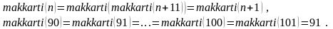 Наконец, всякое начальное n<90 в соответствии с декомпозицией через конечное число рекурсивных вызовов приводит ко второму случаю. Отсюда опять makkarti(n)=91. Таким образом (6) справедливо во всех случаях.