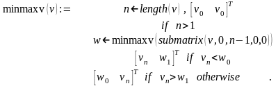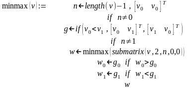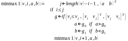 В следующем варианте minmax() функции minmax1() используются три вспомогательных параметра: a, b, i. Первые два из них служат для фиксации текущих значений минимального и максимального элементов массива, а последний для нумерации рекурсивных обращений. Как и в предыдущем случае, каждый рекурсивный вызов уменьшает обрабатываемый массив на два элемента. Но здесь, в отличие от minmax(), они удаляются с разных его концов. Использование вспомогательной функции mima(v) избавляет нас от сложного обращения к minmax1().