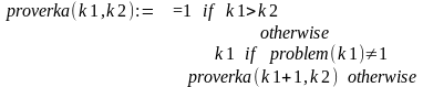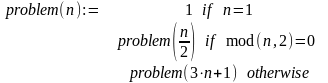 Решение. Хотя данная строка и начата со слова “решение”, ответа на поставленный вопрос мы не знаем и, по-видимому, на сегодняшний день его не знает никто. Более того, неизвестно, для любого ли n problem(n) вычисляется за конечное число шагов. Рассмотренную задачу называют 3n+1 проблемой. Мы включили её в список задач для того, чтобы обратить внимание читателя на следующий факт. Достаточно простые с виду рекурсивные определения функций могут таить в себе глубокие проблемы, решения которых лежат совсем не на поверхности. Тем не менее, конкретные вычисления problem(n) при разных n приводят к одному и тому же значению, равному 1. Ниже приведена рекурсивная программа для проверки истинности утверждения “problem(n)=1” при значениях n из диапазона k1..k2.