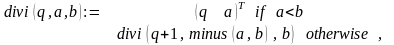 E. Частное и остаток: a/b (b>0). В данной задаче речь идет об отыскании величин q и r из представления: a=qb+r (0rT. Если aa, то a/b=1+(ab)/b, что позволяет организовать декомпозицию. Все сказанное учтено в рекурсивной функции divi(q,a,b). В ней первый аргумент q является вспомогательным параметром. При обращениях к divi() он должен определять базовое значение частного, то есть быть равен нулю. Однако проще решать задачу с помощью вспомогательной функции div(a,b), возлагая на неё решение вопроса о правильном значении вспомогательного параметра вызовах divi(). Это довольно типичный случай при обобщениях исходной задачи за счет введения дополнительных параметров.