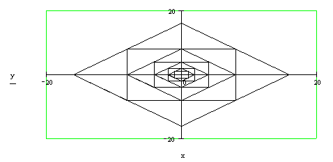 Задача 34. Вложенные квадраты. Пусть на плоскости первый квадрат задан точками: M1(-1,-1), M2(-1,1), M3(1,1), M4(1,-1). Второй квадрат строится так, что вершины первого квадрата являются серединами его сторон и т.д. Составить рекурсивную программу-функцию, которая по заданному натуральному n строит систему из 2n вложенных друг в друга описанным образом квадратов, точнее создает массив точек, последовательное соединение которых на плоскости отрезками и формирует эту систему (см. рис. 3.5).