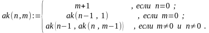 Решение. Вычислить функцию Аккермана, исходя непосредственно из определения (5), удается лишь для некоторых малых n и m. Связано это со сложностью и необычностью рекурсивного определения. В общем случае не только ak() вычисляется через ak(), но и второй из аргументов функции также требует рекурсивного вызова ak(). Соответствующая программа-функция может быть записана так: