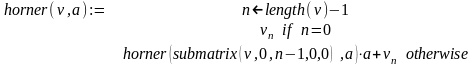 Отсюда ясно, как записать рекурсивный и не рекурсивный варианты алгоритмов вычисления f(x). Нас интересует только первый из них. Параметрами задачи можно считать вектор v и точку a для вычисления f(a). Тривиальный случай – многочлен нулевой степени: f(a) = a0. Декомпозиция получается из указанной выше расстановки скобок в записи f(x). Соответствующая программа-функция выглядит, например, так.
