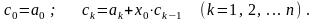 Задача 26. Составить программу-функцию, по которой для многочлена (8) с коэффициентами, составляющими вектор (9) и двучлена xx0 (x0 вещественное или комплексное число), вычисляется вектор c: