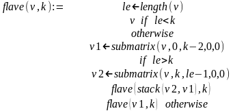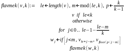 Пусть функция flav(v,k), где v=(1 2 ... n)T решает поставленную задачу и пусть w вектор, полученный из v вычеркиванием одного k-го компонента. После каждой такой операции будем организовывать рекурсивный вызов flav(w,k), прекращая вычисления тогда, когда длина вектора станет равной единице. Пусть le - длина вектора v и s=mod(k,le). Нетрудно видеть, что после одного вычеркивания получим:
