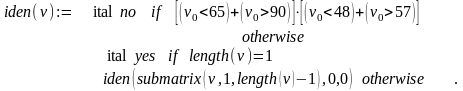 Дополнительное ограничение на первый символ идентификатора (буква, но не цифра) усложняет общую проверку (или буква, или цифра). Чтобы действия были стандартными для всех символов, проверку первого из них будем осуществлять на допустимость отдельно в головной программе. Естественно там же располагать и проверку длины слова, которая должна находиться в пределах от 1 до 6. Тогда в подпрограмме останется решить вполне рекурсивную подзадачу: “если первый символ исходного слова не буква и не цифра, то формируем ответ “не идентификатор”. В противном случае, если длина слова равна единице, то возвращаем ответ “идентификатор”, а иначе укорачиваем слово на первый символ и снова решаем эту же подзадачу. Все сказанное и реализуется головной программой identity(word) и рекурсивной подпрограммой iden(v):