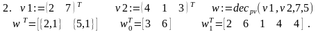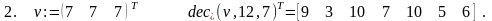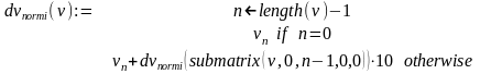 Решение. Функция dec_p_iv(v,p) осуществляет перевод v в p-ичную систему счисления. Результат вычислений формируется, начиная от старших разрядов и далее, в виде вектора, компоненты которого суть p-ичные цифры исходного числа. Функция dec_p_iv(v,p) отличается от ранее рассмотренной функции dec_p_i(v,p) лишь формой представления первого аргумента. Поэтому её вычисление можно свести к вычислению dec_p_i(v,p) с предварительным обращением к рекурсивной функции dv_norm(v), переводящей десятичное число из векторного представления в нормальную форму. Это и сделано ниже.