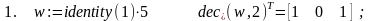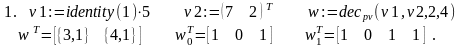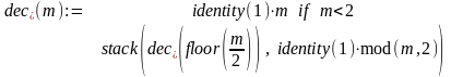 Как мы уже отмечали при реализации функций dec_p_i(m,p) и dec_b_i(m) использован рекурсивный вариант алгоритма последовательного деления выделения цифр p-ичной системы для целых чисел. Пояснений требуют лишь фрагменты вида identity(1)x. Дело в том, что функция stack() в качестве своих аргументов использует векторы или матрицы. И смысл записи identity(1)x состоит в превращении скаляра х в матрицу размера 11 с элементом x.