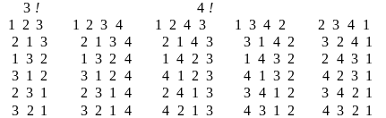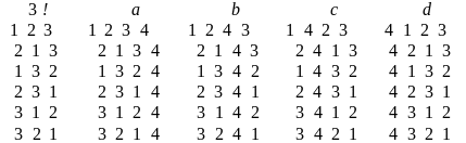 D. Перестановки в лексикографическом порядке. В предыдущем разделе мы ввели понятие лексикографического порядка. Алгоритм генерирования перестановок в таком порядке и соответствующие программы-функции могут быть построены на идеях, близких к тем, которые использовались при генерировании перестановок в антилексикографическом порядке. Поэтому здесь мы ограничимся лишь приведением соответствующих функций permut(p) и permut4(n) и представим полученный по ним результат вычислений для n=3 и n=4 (см. рис. 13.7). Для n=4 полученные перестановки расположены по столбцам.