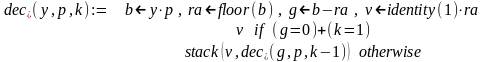 Решение. Функция dec_p_f(y,p,k) решает поставленную задачу, используя рекурсивный алгоритм последовательного умножения. Результат формируется в виде вектора с не более чем k (k=1,2,…) компонентами, которые суть p-ичные цифры числа y, начиная от старших разрядов и далее.