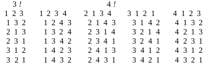 Рекурсивная программа-функция permut5(n) реализует этот, схематично описанный, алгоритм. На рис. 13.8 приведены полученные по permut5(n) перестановки для n=3 и n=4.