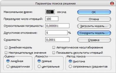 Сходимость - применяется только к нелинейным задачам. Когда относительное изменение значения в целевой ячейке за последние пять итераций становится меньше числа, указанного в поле Сходимость, поиск прекращается.