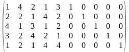 Пусть некоторое предприятие производит 5 видов продукции A, B, C, D и E, затрачивая при этом 5 типов ресурсов. На производство продукции типа A требуется следующее количество имеющихся на предприятии ресурсов (дается количество каждого ресурса, необходимого для производства единицы продукции типа A): 1 – количество ресурса 1, 4 – количество ресурса 2, 2 – количество ресурса 3, 1 – количество ресурса 4, 3 – количество ресурса 5. На производство единицы продукции типа B требуется (в условных единицах): 2 – количество ресурса 1, 2 – количество ресурса 2, 1 – количество ресурса 3, 4 – количество ресурса 4, 2 – количество ресурса 5. На производство единицы продукции типа C требуется (в условных единицах): 4 – количество ресурса 1, 1 – количество ресурса 2, 3 – количество ресурса 3, 1 – количество ресурса 4, 2 – количество ресурса 5. На производство единицы продукции типа D требуется (в условных единицах): 3 – количество ресурса 1, 2 – количество ресурса 2, 4 – количество ресурса 3, 2 – количество ресурса 4, 1 – количество ресурса 5. На производство единицы продукции типа E требуется (в условных единицах): 1 – количество ресурса 1, 2 – количество ресурса 2, 1 – количество ресурса 3, 4 – количество ресурса 4, 4 – количество ресурса 5.