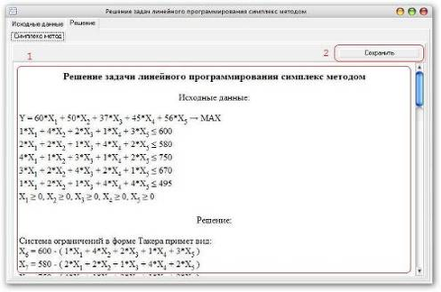 В результате решения поставленной задачи симплекс-методом получили набор производимой продукции x=(x1, x2, x3, x4, x5)=( 15145/103, 8910/103, 0, 1250/103, 3255/103), который удовлетворяет всем наложенным ограничениям и обеспечивает максимальную стоимость данного набора (максимум целевой функции f(x)= 60x1+50x2+37x3+45x4+56x5=15463,4 рублей). Таким образом, можно оптимально спланировать объем производства продукции при наличии заданного количества ресурсов: продукции типа A нужно выпустить 147 единиц, продукции типа B – 86 единиц, продукции типа D – 12 единиц, продукции типа E – 31 единицу, а продукцию типа D – для достижения максимальной прибыли в данных условиях производить не выгодно.