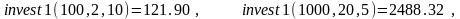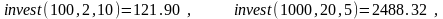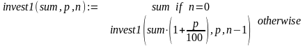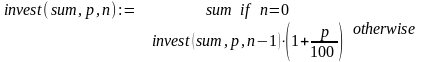 Решение. Пусть invest(sum,p,n) искомая функция. Вычисления значений invest() можно проводить по известной формуле: