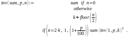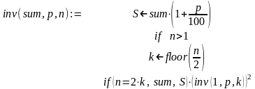 Основанную на этих посылках рекурсивную функцию для решения задачи 1 обозначим через inv(sum,p,n). Указанные посылки обнаруживают такие свойства этой функции.
