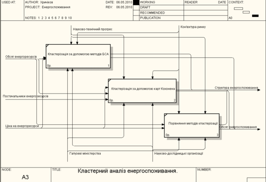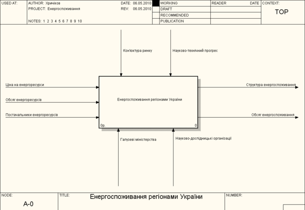 В даному випадку на рис. 2.1, на вході IDEF0 повинні бути присутні постачальники, ціни та обсяг енергоресурсів, а на виході те, що повинні отримати у результаті проведення моделювання: структуру та обсяг енергоспоживання регіонів.