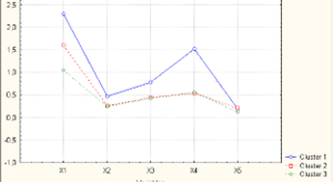 Графічне зображення середніх по факторам на рис. 3.16., дає змогу сказати, що кластери 2 та 3 розділені дуже тонкою гранню, а отже регіони, що потрапили до останнього повинні вдосконалити своє споживання енергоресурсів для того щоб не понести додаткові збитки. Тобто є необхідність введення додаткових іноваційних технологій та обрати шляхи оптимізації.