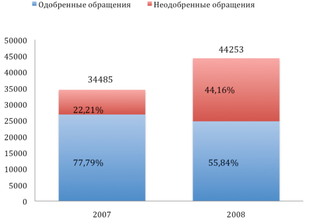 Усугубило ситуацию и то, что некоторые компании не прибегали к хеджированию своих валютных рисков, и полуторакратный рост курса доллара, помноженный на реальное уменьшение доходной части активов, вызванное девальвацией рубля, реализовал риск ликвидности в еще больших объемах. Это при том, что спрос на лизинговые услуги значительно возрос. Количество обращений в лизинговые компании выросло на 22% и достигло 44 253 (Рис.1.4.). При этом одобренных и профинансированных обращений сократилось на 8,5% и составило 24 712. Таким образом видно, что доля одобренных обращений в 2008 году ровна 55,8 % от общего их числа. В то время как в прошлом году эта цифра составляла 77,7%. При этом в абсолютном выражении число одобренных заявок выросло [6].