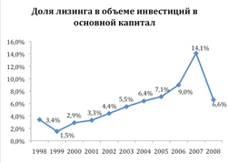 На протяжении последних лет лизинговая отрасль была одной из самых динамично развивающихся в России. За это время значительно выросли объемы и количество сделок. Но также росла конкуренция между лизинговыми компаниями. В борьбе за новые рынки и клиента лизингодатели прибегали к недорогим краткосрочным и среднесрочным кредитам. Но к осени 2008 года мировой финансовый кризис докатился и до России. Стоимость заемных средств резко начала подниматься, а затем банки практически полностью отказались от кредитования. Таким образом, лизинговые компании столкнулись с нехваткой средств. Собственных средств немного, а заемных больше нет. Это привело к тому, что многие лизинговые компании практически свернули свою деятельность к концу 2008 года.