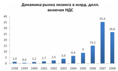 2008 год стал самым тяжелым для российского рынка лизинга за последние 9 лет. Объем нового бизнеса сократился на 24,7% и составил 26,65 млрд. долларов с НДС: