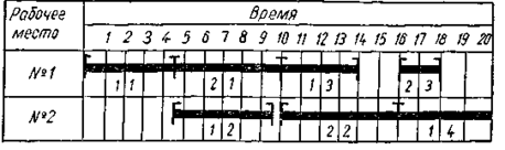 Начало и конец выполнения операции обозначаются отметками ┌ и ┐ соответственно. Под отрезком обычно записываются основные характеристики операции, в нашем случае — номер детали и номер операции. Принято записывать также величину партии деталей, для больших участков полезно указывать еще и номера рабочих мест, на которых выполняются предыдущая и последующая операции данной детали.