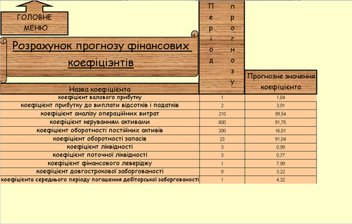 Розрахунок прогнозу фінансових коефіцієнтів ВАТ “ВРЗ” (рис.3.7). Для цього потрібно натиснути лівою кнопкою на вікно з надписом Розрахунок прогнозу фінансових коефіцієнтів.