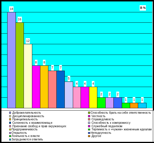 Как видим из Рисунка 8, в число главных элементов этикета чиновников вошли, прежде всего, такие ценности, как доброжелательность, способность брать на себя ответственность, дисциплинированность, а затем уже называются честность, принципиальность, справедливость и др. Только на 12–14-м местах неподкупность.