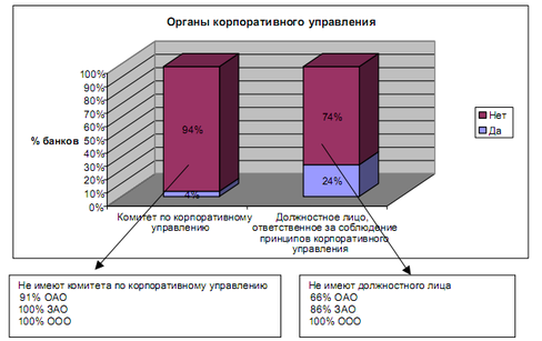 Хотя большинство банков утверждают, что сознают важность корпоративного управления, очень немногие из них имеют специальное лицо или комитет, ответственные за внедрение корпоративного управления в рамках всей организации. Две трети банков не имеют Комитета по вопросам корпоративного управления в структуре своих Наблюдательных советов или специально назначенного сотрудника, отвечающего за совершенствование структуры корпоративного управления и внедрение передовой практики.