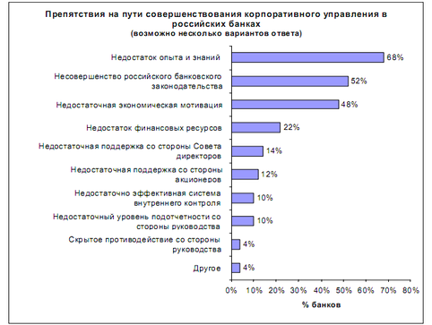 В числе основных препятствий, стоящих на пути развития эффективного Корпоративного управления в финансовом секторе России, многие банки назвали недостаток соответствующего опыта и профессиональных знаний (68%), несовершенство банковского законодательства (52%), а также отсутствие экономических стимулов для внедрения практики корпоративного управления (48%). Отнесение недостаточной экономической мотивации к одному из основных барьеров на пути внедрения корпоративного управления необходимо рассматривать в контексте структуры собственности российских банков, согласно которой большинство банков находятся в собственности небольшой группы акционеров и контролируются ими. Эти акционеры, как представляется, мало заинтересованы в решении проблем корпоративного управления. Это предположение подтверждается также и тем, что такие проблемы, как отсутствие поддержки со стороны Наблюдательного совета и акционеров, были поставлены соответственно на пятое и шестое места.