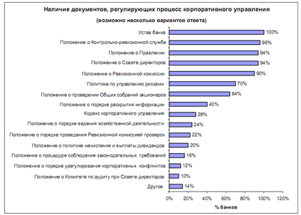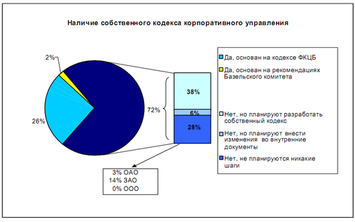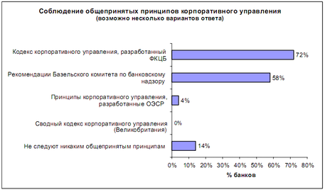 Хотя большинство банков и заявляют о том, что они соблюдают рекомендации и принципы, установленные ФКЦБ и БКБН, лишь 28% банков закрепили эти принципы в своих собственных Кодексах корпоративного управления (ККУ).