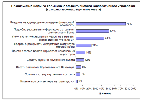 Большинство банков считают надлежащее корпоративное управление важным аспектом своей деятельности и называют многочисленные преимущества, которые могут быть получены от его усовершенствования, такие как улучшение управления рисками (74%), повышение эффективности операций (64%), повышение своей репутации в глазах общественности (60%), увеличение уровня капитализации банка (54%). Следует отметить, преимущества хорошего корпоративного управления для повышения качества управления рисками и эффективности внутренних операций были банками оценены выше, чем преимущества корпоративного управления для привлечения инвестиций.