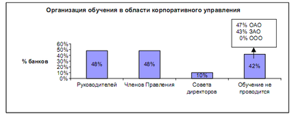 Несмотря на то, что банки отмечают, что хорошее корпоративное управление способствует успешной деятельности банка и что оно должно начинаться «сверху», 42% респондентов отметили, что они не организуют специальных учебных программ в этой области для членов Наблюдательного совета и/или Правления. Характерно, что в 48% банков представители руководства регулярно участвуют в таких учебных мероприятиях, тогда как в отношении членов Наблюдательного совета эта доля значительно ниже (10%). Две трети руководящихработниковпроходилиучебнуюподготовкуболееодногоразавгод, что является положительным фактом.