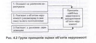 Оскільки у процесі оцінки об'єктів нерухомості взаємодіють три елементи - суб'єкт, об'єкт і ринкове середовище - фахівцями, виділяються такі групи принципів