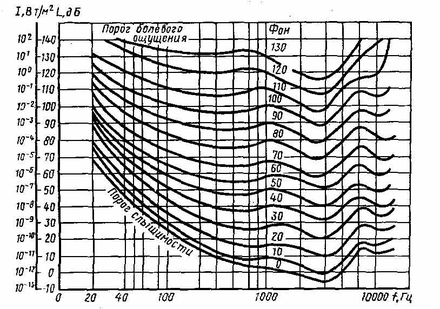 Человеческое ухо реагирует не на абсолютный прирост силы звука, а на относительное изменение силы звука. Изменение интенсивности и звукового давления воспринимаемого звука огромно и составляет соответственно 1014 и 107 раз.