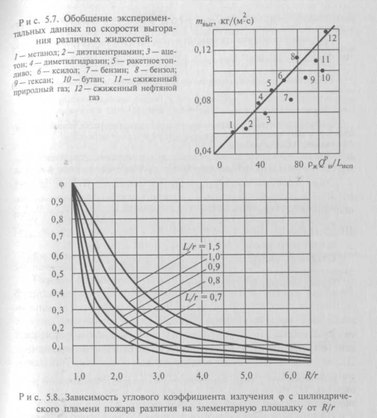 — низшая теплота сгорания топлива, Дж/кг; LИСП — скрытая теплота испарения жидкости, Дж/кг, С — коэффициент пропорциональности, значение которого, равное 1,25 *10-6 м/с, получено путем обработки многочисленных экспериментальных данных по выгоранию большинства органических жидкостей и их смесей (рис. 5.7).