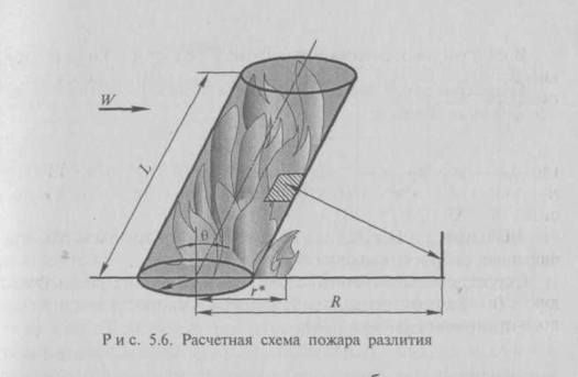 Пламя пожара разлития при расчете представляется в виде наклоненного по направлению ветра цилиндра конечного размера (см. рис. 5.6), причем угол наклона