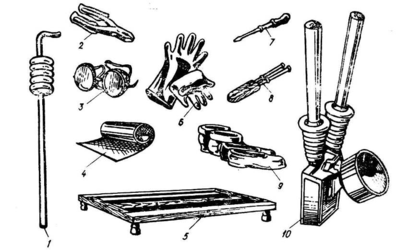 1- выключающая штанга; 2 – пасатижы; 3 – защитные очки; 4 – изолирующий коврик; 5 – изолирующая подставка; 6 – изолирующие перчатки; 7 – отвертка; 8 – клещи; 9 – технические галоши и клещи; 10 – токоизмерительные клещи.