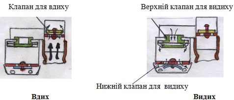 Клапанна коробка (рис. 2) призначена для розподілу потоку повітря. В ній є один клапан для вдиху і два для видиху.