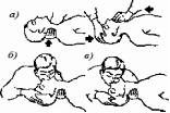 а — подготовка пострадавшего; б,в -искусственное дыхание «изо рта рот» и «изо рта в нос»