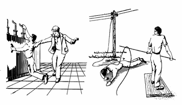Для спасения пострадавшего иногда возможно набросить на голые провода другой голый предварительно заземленный провод; таким образом, ток отведется в землю, напряжение прикосновения понизится до безопасной величины и пострадавший будет в состоянии освободиться от провода.
