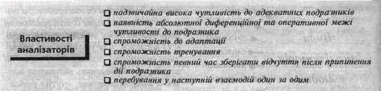 Основні види рецепторів: механорецептори, що сприймають механічну енергію: хеморецептори приймають механічну енергію: до них належать рецептори слухової, вестибулярної, рухової, частково вісцеральної чутливості; хеморецептори - нюховий, смаковий; терморецептори, що мають шкірний аналізатор; фоторецептори - зоровий аналізатор та інші види. Кожен рецептор виділяє з множини подразників зовнішнього і внутрішнього середовища свій адекватний подразник. Цим і пояснюється дуже висока чутливість рецепторів. Усі аналізатори завдяки своїй однотипній будові мають загальні психофізіологічні властивості.