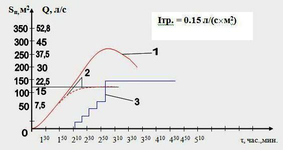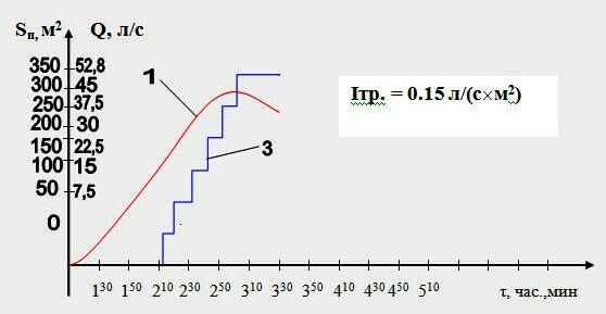 2. Требуемый расход огнетушащего вещества определяется умножением величины площади пожара, взятого на момент времени из таблицы «Организация тушения возможного пожара первым РТП», на требуемую для данного объекта интенсивность. Если огнетушащее вещество подавалось на площадь тушения, то необходимо определить ее величину и провести линию площади тушения и требуемого расхода при подаче его на площадь тушения.