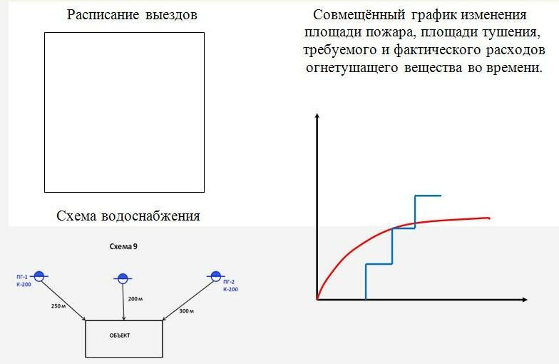 • совмещенный график изменения площади пожара, площади тушения, требуемого и фактического расходов огнетушащего вещества во времени;