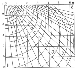 береться, як правило, з графіка лінійних ізолюксів (рис. 2.1). За відсутності для даного світильника лінійного ізолюкса (але за відомого світлорозподілення світильника) визначення умовного горизонтального освітлення для сили світла 100 кД, а потім із залежності
