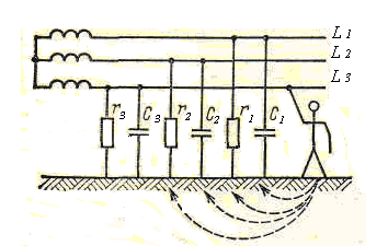 r1, r2, r3 – сопротивление изоляции проводов электросети; с1, с2, с3 – ёмкость проводов электросети